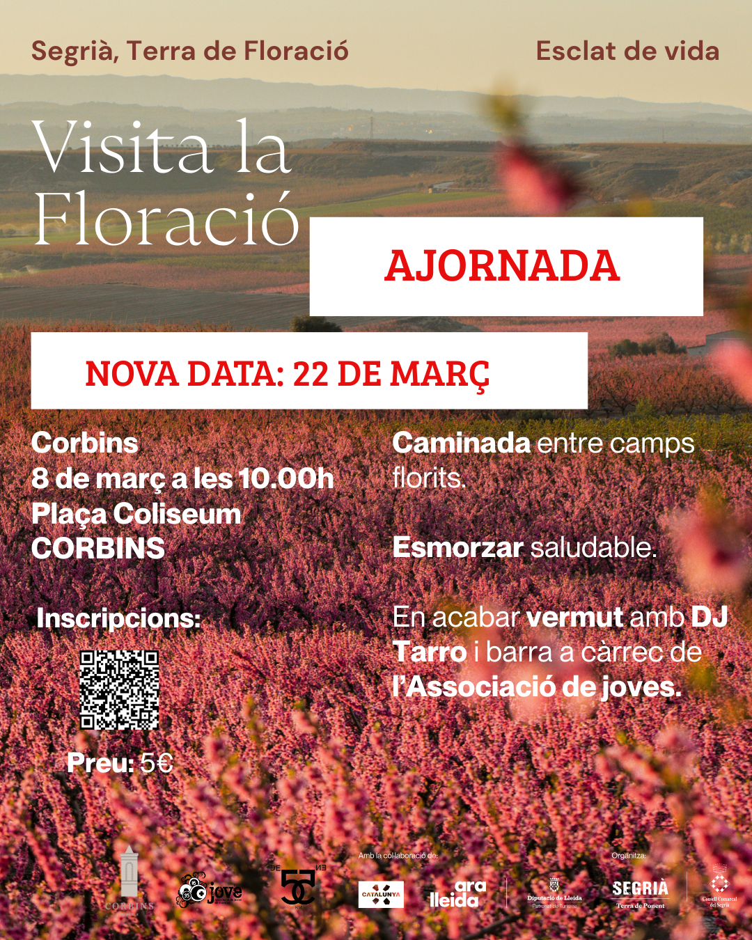 S'informa que a causa de les pluges previstes per aquest cap de setmana, la caminada entre flors prevista per aquest diumenge 8 de març, queda ajornada per al pròxim diumenge 22 de març.