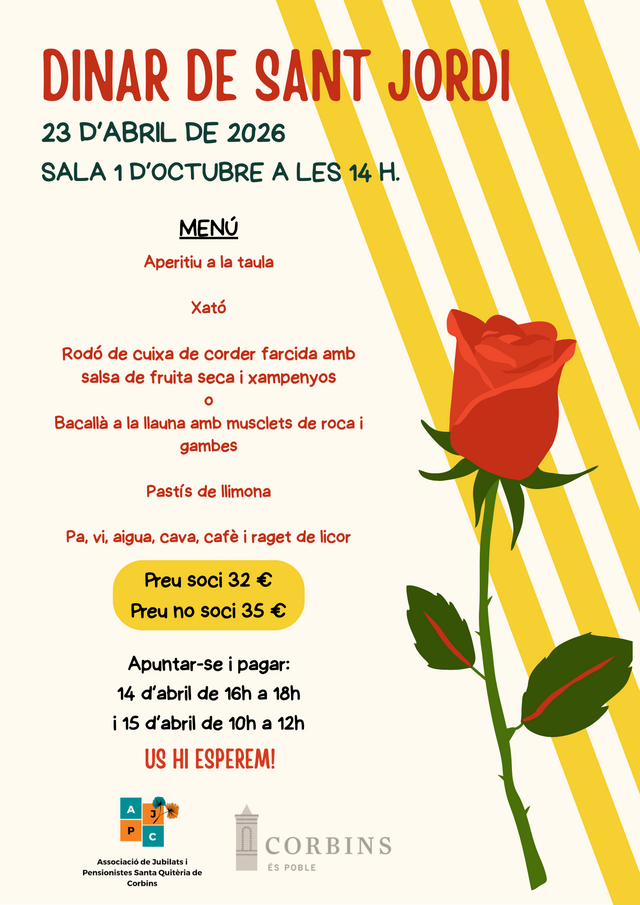 L'associació de jubilats/es informa que el proper dia 23 es farà el dinar de Sant Jordi, es podrà apuntar i realitzar el pagament al casal, el dimarts dia 14 de 16 h a 18 h de la tarda i dimecres dia 15 de 10 h a 12 h del matí.