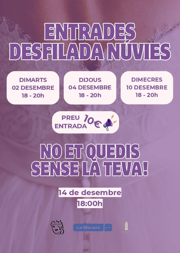 ADOCOR informa que avui dimarts 2 de desembre, de 18 a 20 h. al Centre de la Dona, es vendran entrades per la desfilada de vestits de núvia que tindrà lloc el dia 14 de desembre.