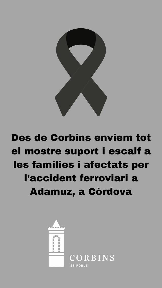 Des de l'Ajuntament de Corbins enviem tot el nostre suport i escalf a les famílies i afectats per l'accident ferroviari ocorregut a Adamuz (Còrdova).