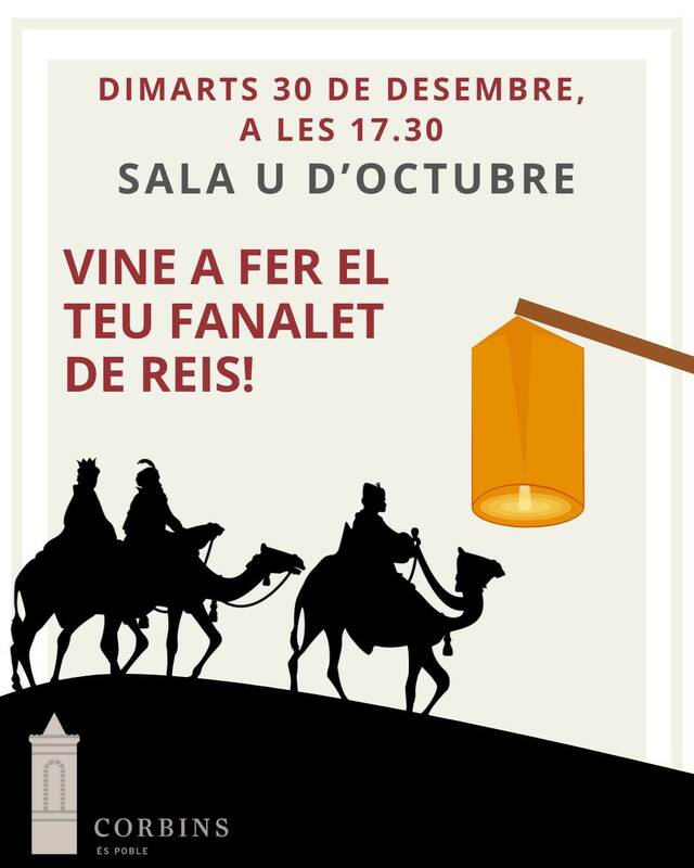 L'Ajuntament informa que demà dimarts 30 desembre, a les 17:30 h. a la Sala 1 d'Octubre, s'ha organitzat un taller de fanalets de Reis. Vine a fer el teu, t'hi esperem!