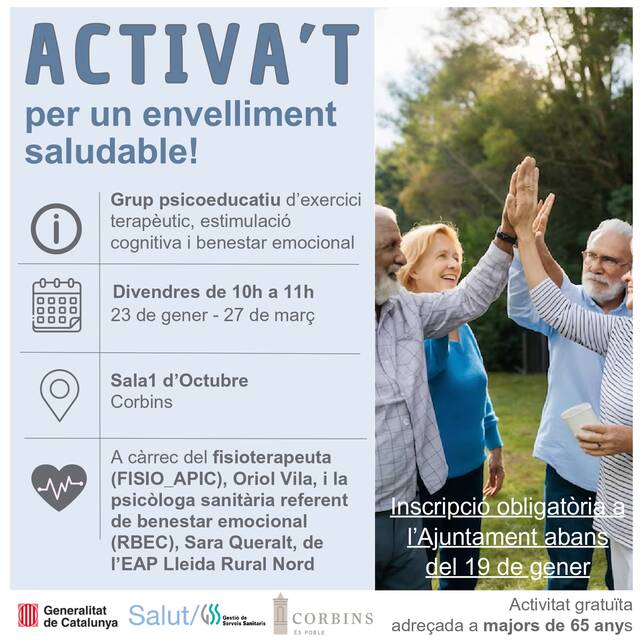 El taller ACTIVA'T per un envelliment saludable, demà divendres 27 de febrer es realitzarà al Centre Cívic en el mateix horari habitual.