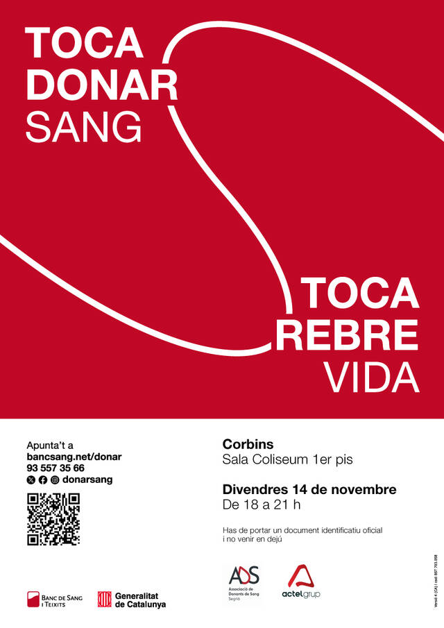 Es comunica que la campanya de Donació de Sang a Corbins, tindrà lloc divendres 14 de novembre de 18:00 a 21:00 h, al primer pis de la Sala Coliseum.