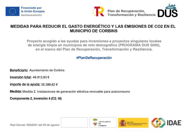 Descripció: Projecte per a la instal·lació d'una Planta Solar Fotovoltaica de 30 kW a Corbins.Contracte inclòs dins del projecte “MEDIDAS PARA REDUCIR EL GASTO ENERGÉTICO Y LAS EMISIONES DE CO2 EN EL MUNICIPIO DE CORBINS” DE L’AJUNTAMENT DE CORBINS, aprovat per l’IDAE (Instituto para la Diversificación y Ahorro de la Energía) en el marc del programa DUS 5000 finançant amb fons procedents del Pla de Recuperació, Transformació i Resiliència (PRTR) amb càrrec a Fons del Mecanisme de Recuperació i Resiliència de la Unió Europea – Next Generation EU.