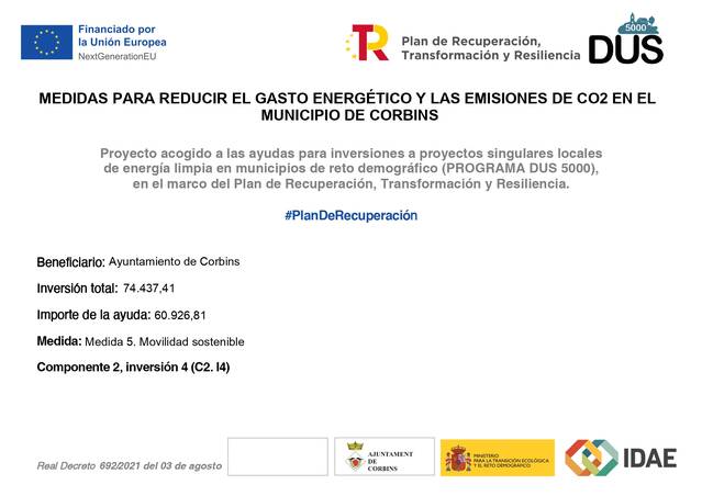 Descripció: Projecte per a la instal·lació d'una Estació de Recàrrega Semiràpida per a vehicles elèctrics al municipi de CorbinsContracte inclòs dins del projecte “MEDIDAS PARA REDUCIR EL GASTO ENERGÉTICO Y LAS EMISIONES DE CO2 EN EL MUNICIPIO DE CORBINS” DE L’AJUNTAMENT DE CORBINS, aprovat per l’IDAE (Instituto para la Diversificación y Ahorro de la Energía) en el marc del programa DUS 5000 finançant amb fons procedents del Pla de Recuperació, Transformació i Resiliència (PRTR) amb càrrec a Fons del Mecanisme de Recuperació i Resiliència de la Unió Europea – Next Generation EU.
