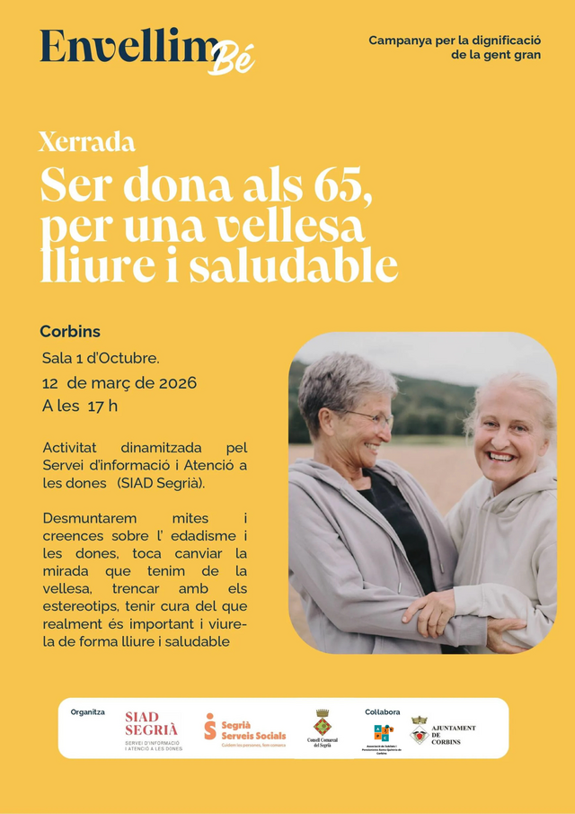 El pròxim dijous 12 de març a les 17:00 h a la sala 1 d'Octubre de Corbins desmuntarem mites i creences sobre l'edadisme i les dones en una xerrada d'envellim bé!
