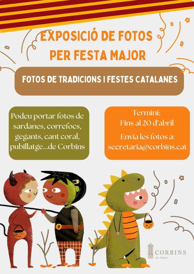S'informa que podeu portar fotos de sardanes, correfocs, gegants, cant de coral, pubillatge o altres tradicions i festes catalanes de Corbins per l'exposició de fotos de la festa major 2026.