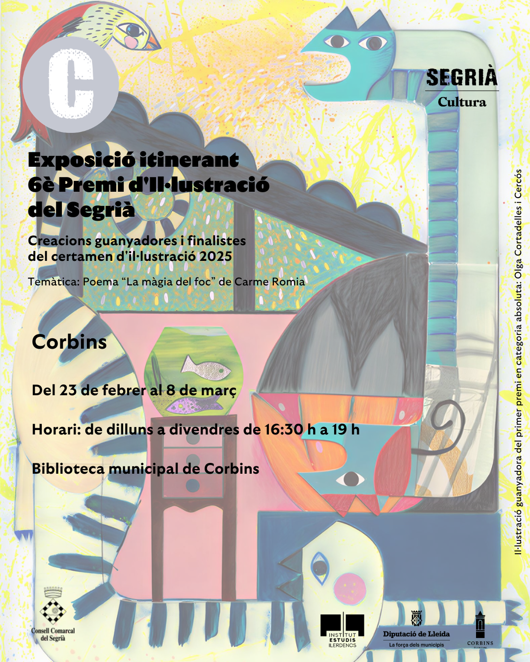 L'Ajuntament informa que aquest 23 de febrer i fins als 8 de març acollim a la biblioteca municipal de Corbins l'exposició de creacions guanyadores i finalistes del certament d'il·lustració 2025 inspirats en el poema "La màgia del foc" de l'escriptora Carme Romia.