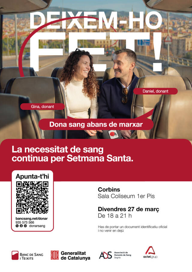 S'informa que aquest divendres 27 de març de 18:00 h a 21:00 h a la sala Coliseum es podrà donar sang.
