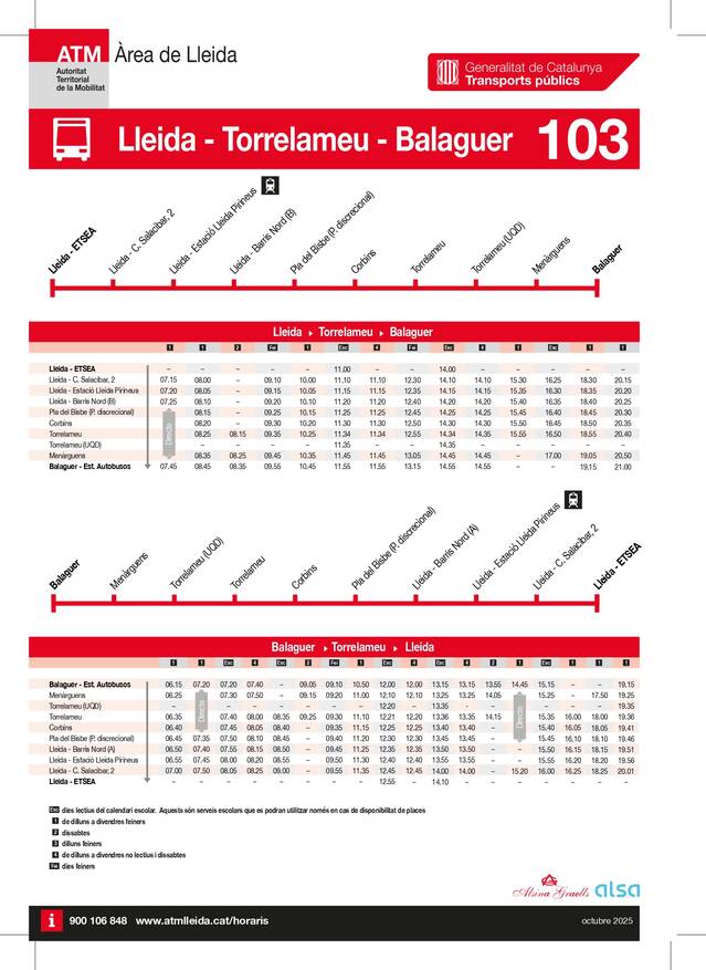 ATM informa de la modificiació en l'horari del bus de la línea 103 Lleida-Torrelameu-Balaguer es va fer efectiva el dijous 18 de setembre, en la qual es va afegir el bus que passa per Corbins a les 7:45 h. i arriba a la parada del barris Nord a les 7:55 h.