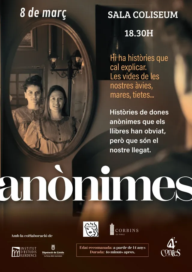L'ajuntament informa que aquest diumenge 8 de març a les 18:30 a la Sala Coliseum és dura a terme l'obra de teatre "Anònimes".