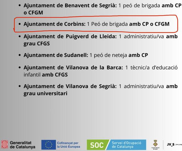 L’Ajuntament de Corbins, dins el programa “Joves en pràctiques” del SOC, ofereix un contracte de peó de brigada a jornada complerta durant el període d’un any, adreçat a joves majors de 16 i menors de 30 anys.