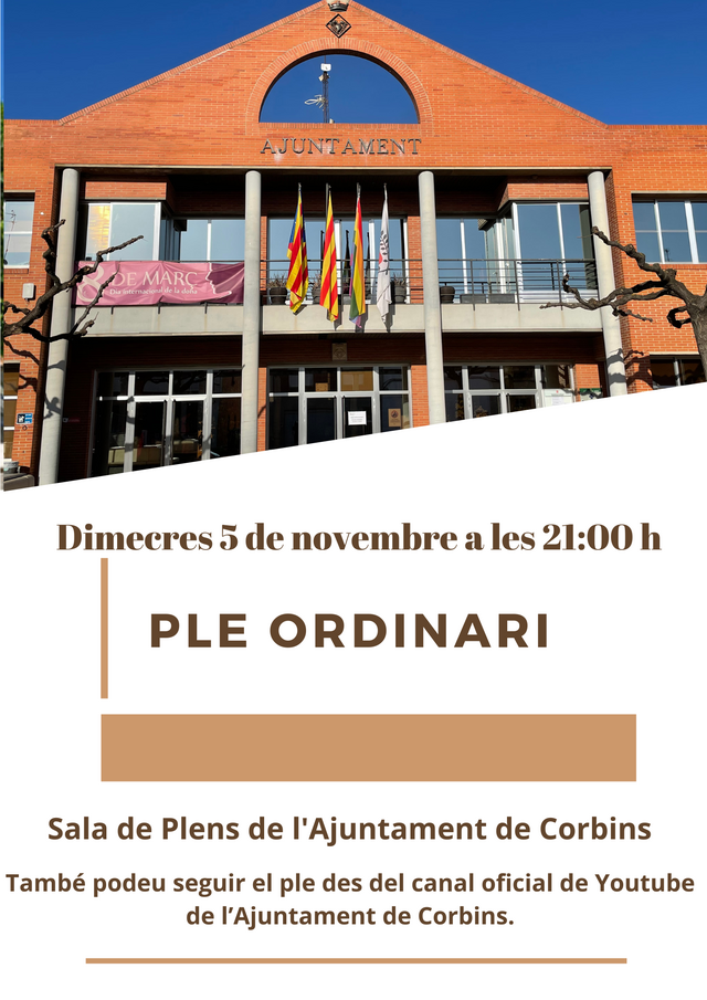 L'Ajuntament informa que avui dimecres 5 de novembre a les 21.00 h hi haurà ple ordinari a la Sala de Plens de l'Ajuntament.