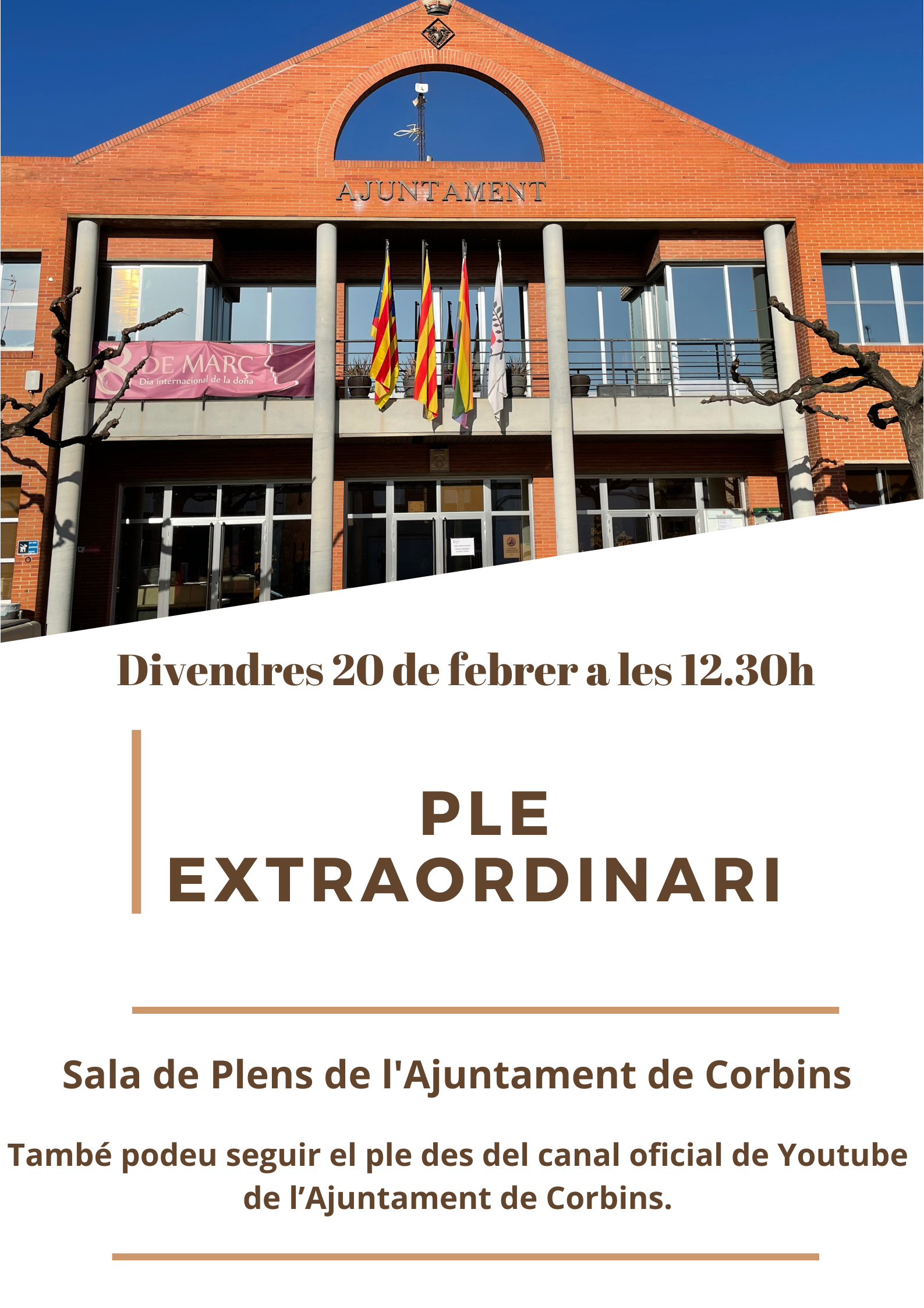 L'Ajuntament informa que avui divendres 20 de febrer a les 12:30 h hi haurà ple extraordinari a la Sala de Plens de l'Ajuntament.