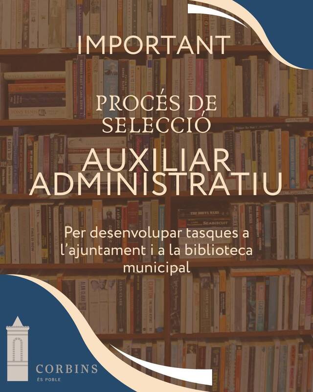 L’Ajuntament de Corbins convoca el procés selectiu per la cobertura de la plaça d’auxiliar administratiu amb desenvolupament de tasques a l’Ajuntament i a la biblioteca municipal, funcionari de carrera, per sistema de concurs oposició.