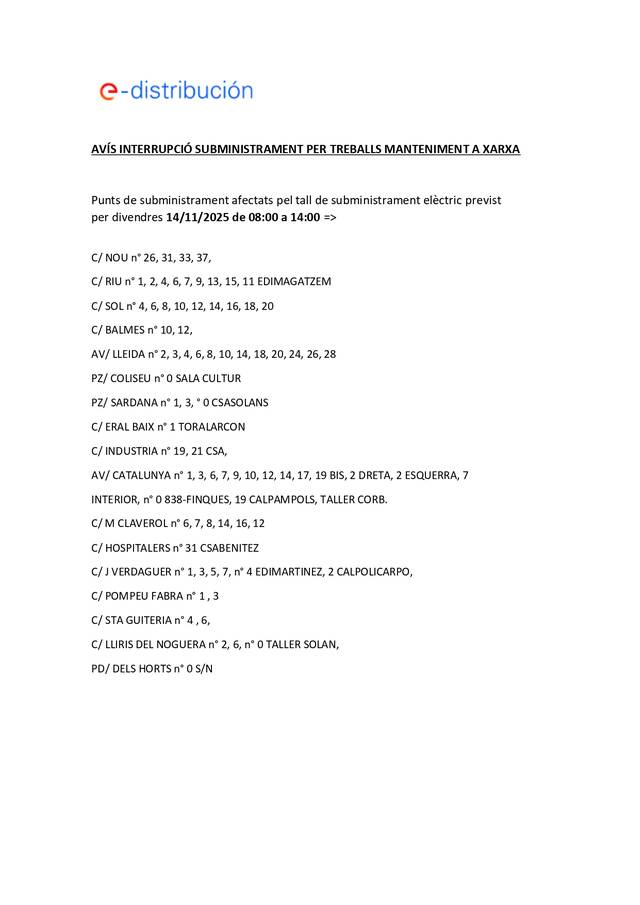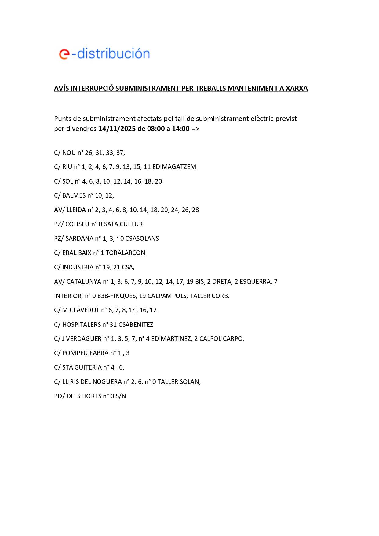 Endesa comunica que a Corbins hi haurà tall de subministrament elèctric DEMÀ divendres 14 de novembre de 2025 de 08:00 h a 14:00 h.